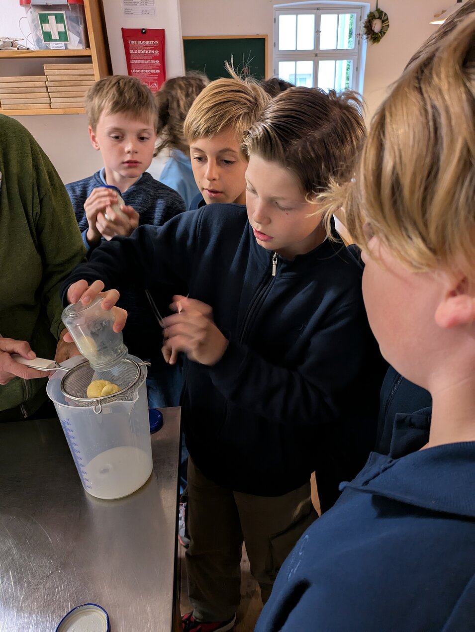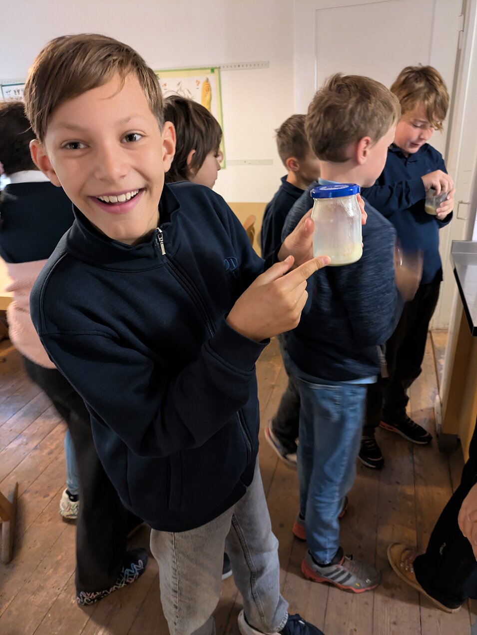 Auf dem Lernbauernhof konnten die Schülerinnen und Schüler viele Dinge rund um die Milch und den Käse entdecken. Sie lernten den Prozess der Butterherstellung kennen und durften sogar selbst Butter herstellen.